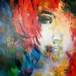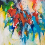 Drie geabstraheerde figuren die op vrouwen lijken.Veelkleurig werk in acryl.