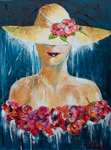 Een dame die uit de bloemen oprijst. De lady is met de kwast en spons geschilderd in acryl. De bloemengroep is gegoten in de pouring methode met vloeibaar acryl. Vrij realistisch alleen de achterkant is zichtbaar.