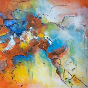 Een schilderij in abstractie met vele kleuren en spons-techniek. Zijkanten doorgeschilderd.