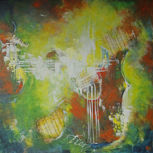 Acrylwerk met figuratieve, geabstraheerde muziekfiguren. Zijn het gitaren of violen? De snaren zijn in beeld Ook zijn delen muziekpapier opgeplakt.
