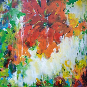 2021Gloriosa Een bloem temidden van abstractie, maar zij is de baas . Groots en majestueus. Veelkleurig werk met als aandachtspunt de rode bloem. Vele kleuren in acryl en dik in de verf.Groot formaat 100x100 cm.